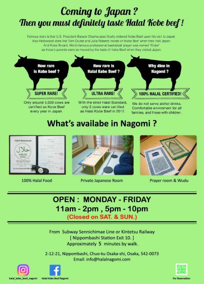ناغومي للحم كوبي الحلال هو المطعم الذي يقوم بتقديم لحم كوبي الحلال في أوساكا. ولقد قامت إدارة المطعم بتغيير قائمة الطعام الأساسية بالترافق مع ساعات العمل. إن أحببتهم الإطلاع أكثر حول مطعم لحم كوبي الحلال في ناقومي هنا