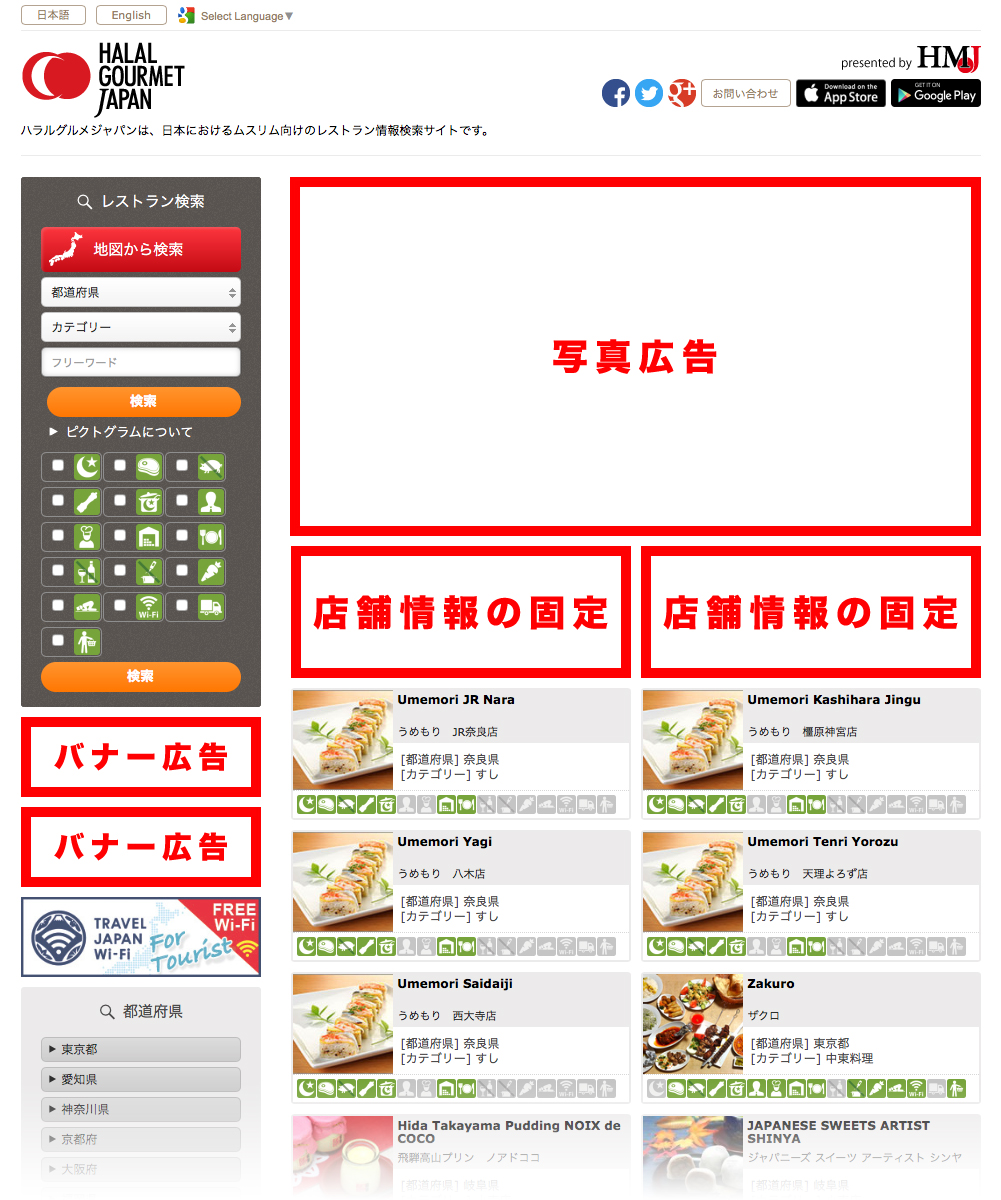Halal Media Japan adalah situs yang menyebarluaskan informasi Halal dengan lebih dari 200,000 pengunjung per bulan, sedangkan Halal Gourmet Japan adalah situs pencarian restoran Halal dan ramah Muslim terbesar di Jepang. Kami dapat mempromosikan bisnis Anda dari berbagai saluran media, seperti pada laman Facebook kami yang telah mendapatkan lebih dari 100,000 Suka/Like, Twitter, Instagram, YouTube serta media cetak berupa Peta bagi Umat Muslim.