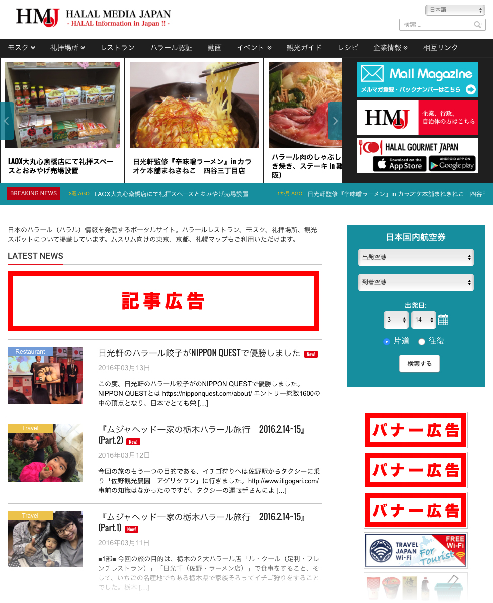 Dapat menayangkan iklan dengan media yang dikelola oleh Halal Media Japan, dapat mempromosikan bisnis Anda pada 20 miliar umat Muslim di penjuru dunia. Halal Media Japan adalah situs yang menyebarluaskan informasi Halal dengan lebih dari 200,000 pengunjung per bulan, sedangkan Halal Gourmet Japan adalah situs pencarian restoran Halal dan ramah Muslim terbesar di Jepang. Mulai dari media sosial hingga media cetak berupa panduan wisata, keunggulan kami adalah Anda dapat memilih cara terbaik melalui berbagai saluran media yang kami sediakan.