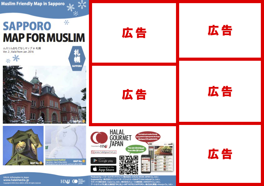 Peta kami memuat lokasi restoran Halal bagi wisatawan Muslim dan ruang shalat. Saat ini, Halal Media Japan telah menerbitkan peta dari tujuh kota di penjuru Jepang.