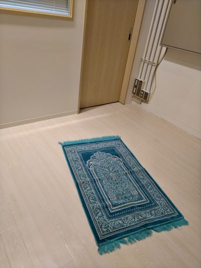 部屋はとても広々としており、3人ほどが同時に礼拝することができます。また、礼拝マットも借りることもできます。ただし、ウドゥ(小浄)のためのスペースが無いため、お近くの洗面所にてウドゥを行わなければなりません。