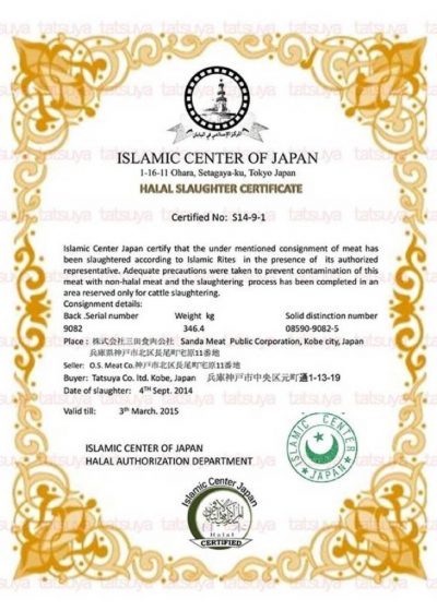 ・使用する神戸牛は、イスラミックセンター・ジャパンおよびUAE政府(ESMA)によるハラール認証を取得した商品です。ハラールと畜証明書をお渡しすることも可能です。
